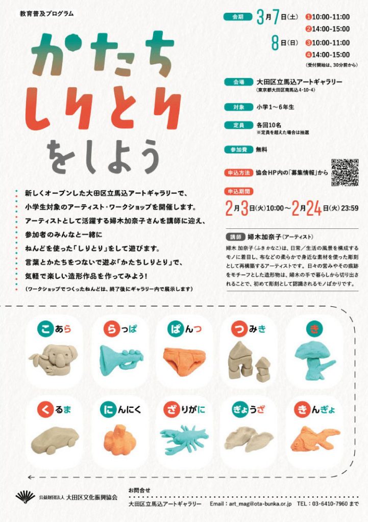 කලාකරුගේකනාකෝ ෆුකිさんを講師に迎え、参加者のみんなと一緒にねんどを使った「しりとり」をして遊びます。言葉とかたちをつないで遊ぶ「かたちしりとり」で、気軽に楽しい造形作品を作ってみよう!なお、ワークショップで作ったねんどは終了後にギャラリー内で展示します。